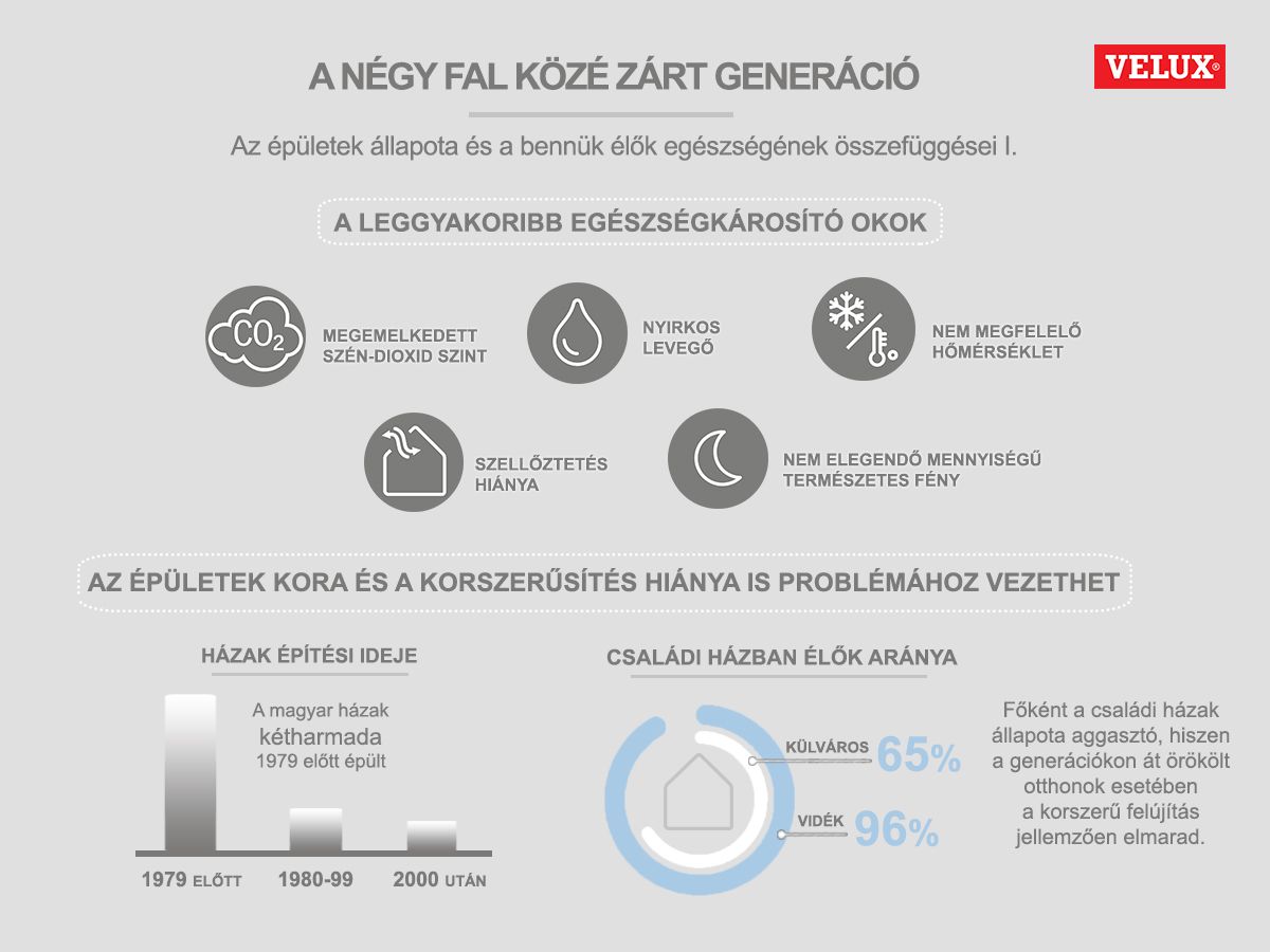 A Healthy Homes Barometer felméréssorozat az épületek állapota és a bennük élők egészsége közötti összefüggéseket vizsgálta. Leggyakrabban a beltéri hőség vagy éppen a túl alacsony hőmérséklet, a sötétség és a levegő nyirkossága okoz problémát. A kiváltó okok között szerepel az épületek kora és a természetes fény hiánya, a beltéri teregetés, a nem megfelelő szellőztetés, valamint a kémiai anyagokkal szembeni gondatlanság. Háromból két magyarországi ház 1979 előtt épült, ötből egy 1980-1999 között, és csupán tízből egy a kétezres évek után. Az eredmények tanúsága szerint főként a családi házak állapota aggasztó, melyeket generációk sokasága birtokol egymást követően, és ahol az esztétikai átalakításon felüli korszerűsítés jellemzően elmarad. Márpedig a külvárosban, elővárosban élő magyarok 65 százaléka, a vidéken élők 96 százaléka él családi házban.