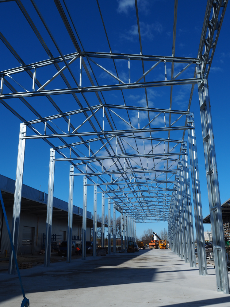 A csarnokok 10 méter magasak: az egyik 16×138 méter alapterületű, oldalfalak nélküli tárolószín, a másik acélcsarnok pedig 15×41 méteres, hőszigetelés nélküli készterméktároló raktár. Technikailag a harmadikként megrendelt, csomagolóüzemnek készülő Frisomat épület a legérdekesebb. Ugyan a tűzihorganyzott szerkezet igen könnyű, a technológia mégis lehetővé teszi, hogy ebben a 1140 négyzetméter alapterületű és 10 méter magas hőszigetelt csarnokban 2 darab, a csarnok tartószerkezetére rögzített 5 tonnás daru is munkába álljon. Az előregyártott, horganyzott acélépületeknél a minőségi alapanyaggal és a hegesztés nélküli, csavarozott összeszereléssel együtt érik el a hosszú élettartamot és az épületek alacsony karbantartási igényét. Gábriel János facility manager szavaival élve a technológia és a versenyképes ár nyerő párost alkot a Frisomatnál. Mosolyogva tette hozzá, hogy ráadásul a zord téli körülmények és a „rengeteg csavar ellenére” is pontosan tudták tartani a határidőket. Természetesen versenyeztetik a beszállítókat a területfejlesztés során, de kis méretű csarnokoknál eddig nem találtak kategóriájában megfelelőbbet.