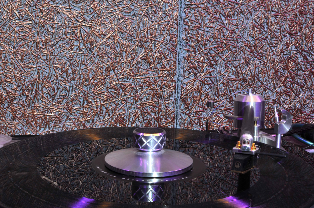 Az egyik a szélessávú elnyelő, amelyet a Knauf Insulation által gyártott Heraklith C, 35 mm vastagságú fagyapottáblákkal alakítottak ki, amely mögé 50 mm vastag ásványgyapotot helyeztek. Ez a kombináció igen hatékony hangelnyeléssel bír, és számos akusztikai munkában bizonyult már kiváló és költséghatékony megoldásnak. Annak érdekében, hogy ne legyen túlcsillapítva a tér, a mennyezet nagy részén a Heraklith C táblákat nem kombinálták ásványgyapottal, így azok hangelnyelési foka jelentősen alacsonyabb. De nem csupán hanggátló, hanem esztétikai szerepe is van a Heraklith-nak: egyedi domborzatának köszönhetően a festés különleges látványt nyújt, ezzel emelve a terem hangulatát. A lapok jellegzetes felületi struktúráját felhasználva készültek a „kétszínű” festések. Egy matt türkiz színre fújt Heraklith táblára került fényes felületi hengerelés dekorfestékkel, kék és bronz színben, és egy matt vörösesbarnára fújt Heraklith-ra került ugyanaz a fényes kék és bronz dekorfesték, egészen más hatást eredményezve. A vászonhoz közeli mennyezeten maradt a matt vörösesbarna szín. Mindezt változtatható színű ledsoros világításokkal lehet különbözőképpen megvilágítani. Ez az egyedi megoldás különleges hangulatot áraszt a zene szentélyébe belépők felé.