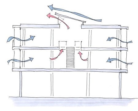 • téli nappalokon kihasználható a nap ereje, miközben a folyosókon egy-egy szárny megnyitásával friss levegő juttatható az épületbe;