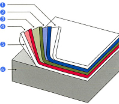 Az Unisolar cella rétegei: 1. tapadóréteg 2. kék cella 3. zöld cella 4. vörös cella 5. fényvisszaverő fémréteg 6. rugalmas réteg (rozsdamentes acél)