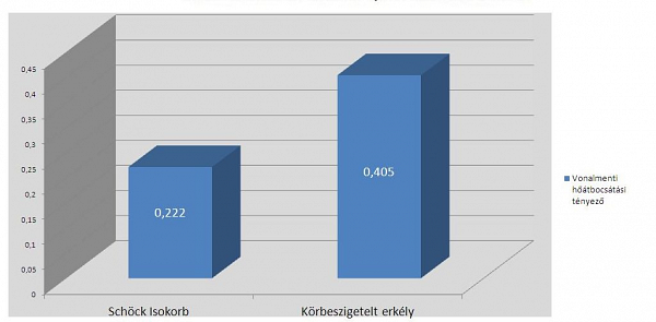 Az összehasonlíthatóság érdekében az erkélycsatlakozás különbözőségén kívül minden egyéb feltétel (falvastagság, födémvastagság, belső rétegrend) azonos geometriájú és anyagú. A vizsgálat eredménye, hogy a belső felületre vonatkoztatott Ψi hőátbocsátási tényező nagy különbséget mutat a Schöck Isokorb elemmel elválasztott, illetve a körbeszigetelt erkély között.