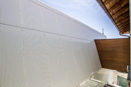 Az új épületnek egységes felületet kellett adni, „ezért úgy határoztunk, hogy a teljes épületet perforált lemezzel burkoljuk” – mondja az építésznő – „mégpedig az Rg 10-25,98-as, 3 mm vastagságú, körlyukasztású perforált lemezzel.” Ehhez azonban le kellett küzdeni néhány felmerülő akadályt. „A levegő hőmérsékletének ingadozására a perforált lemez vetemedéssel reagálhat, ezért különböző hőmérsékletekre kiszámoltuk a lemez természetes hőtágulását, így döntöttünk a 3 mm vastagságú lemez alkalmazása mellett.