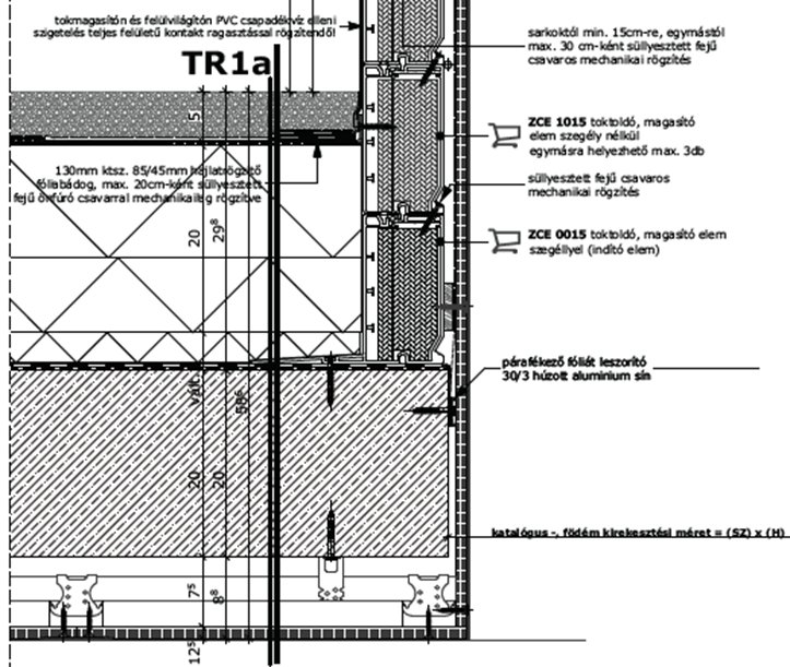 Az indító elem minden esetben a ZCE 0015 tokmagasító elem, amely szegéllyel is el van látva a bitumenes lemezcsatlakozások könnyű kialakításához. A szegélyen erre kialakított horonyban kell rögzíteni a födémhez 30 cm-enként.