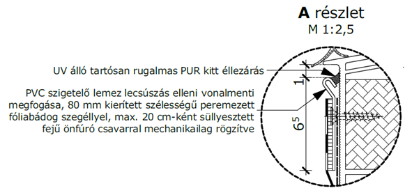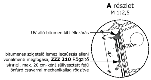 A lábazat külső oldalán, a felülvilágító peremének vonala mentén, mechanikai rögzítéssel kell gondoskodni a PVC vagy bitumenes lemez lecsúszás elleni védelméről. A VELUX termékpalettájában megtalálható ehhez a ZZZ 210 rögzítősín, ami minden kupolamérethez külön rendelhető.