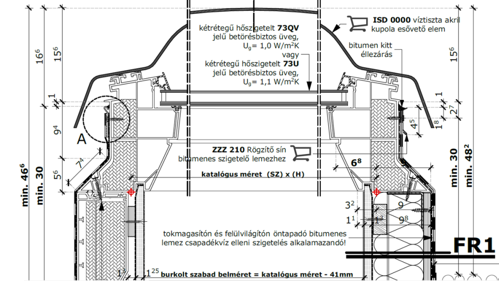 A burkolt szabad belső méret a katalógus méretnél 41 mm-rel kisebb, mivel a tetőtéri ablakokál már megszokott módon a felülvilágító kupolák lábazata is úgy lett kialakítva, hogy képes legyen fogadni a gyári BBX párafékező fóliát és a 12,5 mm-es gipszkarton lapokat.