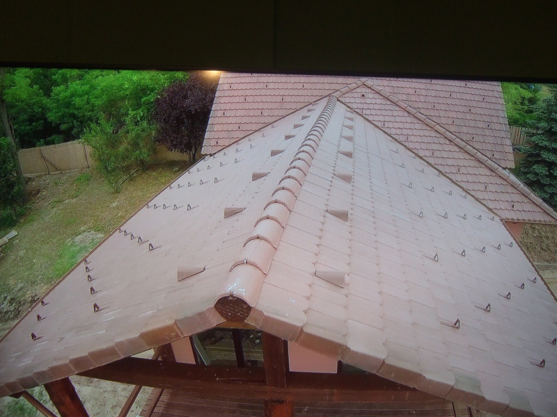 A Terrán-tetőspecialistaként dolgozó szakember lapunk kérdésére még elmondta: a mintegy 270 négyzetméteres tető kivitelezésében különlegesnek mondható szakmai kihívások nem voltak; az összetett tetőidom eltérő hajlásszögű tetősíkjainak találkozását rutinosan meg tudták oldani. A tóra néző terasz háncsolt fenyő gömbfa tartóoszlopaira támaszkodó tetőnél igényelt a szokásosnál több időt és figyelmet a szerkezet beállítása.