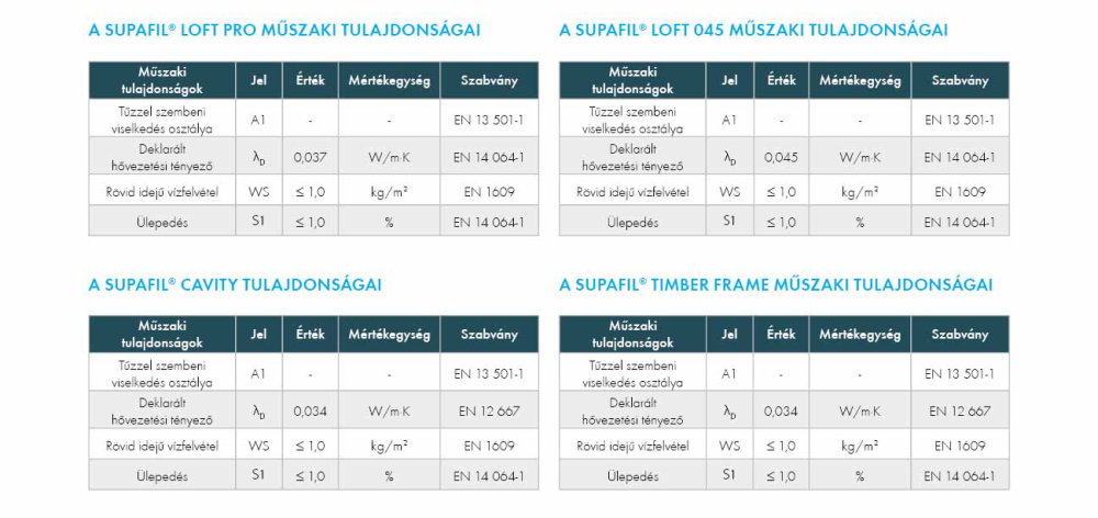 A Supafil kötőanyag nélküli tiszta üveggyapot, mely régi vagy új épületek hőszigetelésének javítására alkalmazható. A Supafil termékek tulajdonságait az EN 14064-1:2010 szabványnak megfelelően vizsgálják és deklarálják. Az ígért hőtechnikai tulajdonságok eléréséhez a kivitelezőnek szakszerűen, a szükséges testsűrűségben kell beépíteni az anyagot.
