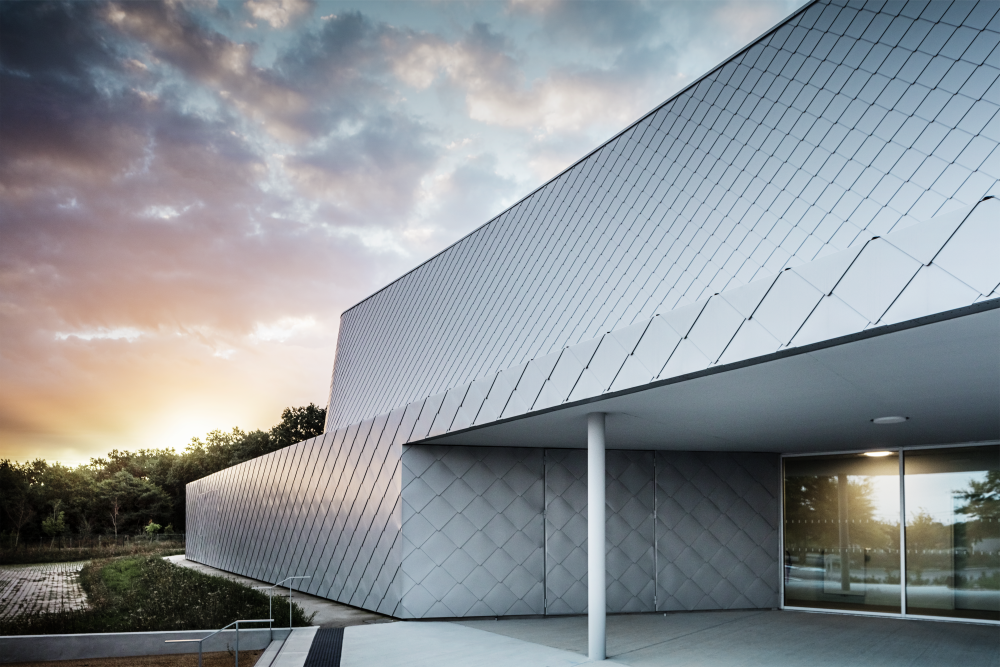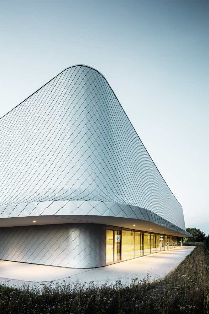 A homorú és domború íveket szabályosan és hibátlanul követő, mintegy 120 000 PREFA tetőfedő és falburkoló rombusz – mint az épület látványát meghatározó elem – már a tervezési koncepció fontos részévé vált. A kihívásokkal teli megvalósításhoz azonban a beruházói akaraton, a tervezői elképzelésen túl minőségi kivitelezésre is szükség volt.