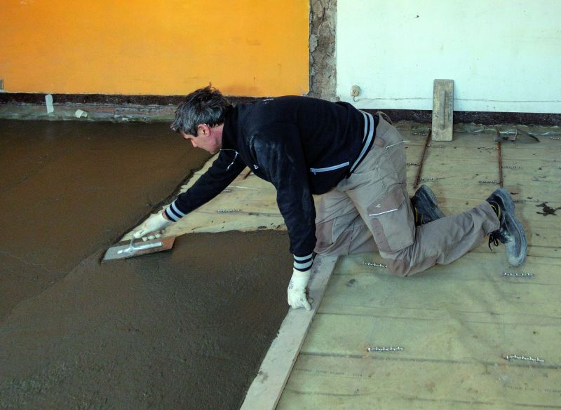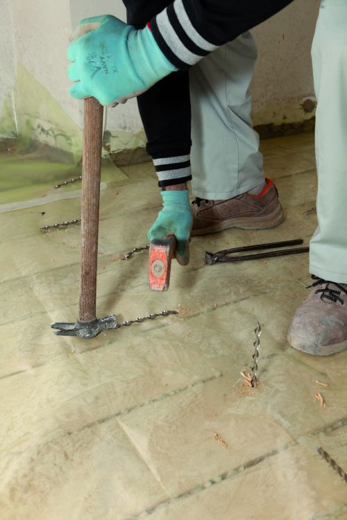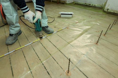 Az első lépés az aljzat előkészítése volt (nagyjából 70 m2 alapterületen). Ehhez eltávolították a fa födémlemezt borító régi rétegeket, egészen a deszkáig. Az aljzat megtisztítása után a teljes felületet a célnak megfelelő vastagságú átlapolt polietilén fóliával fedték le, hogy útját állja a padlóra folyt, illetve a lecsepegő víznek. A következő lépés az összekötő horgonycsapok elhelyezése volt, amihez megfelelő hosszúságra vágott Mapei Steel Dry 316 ultra nagy szilárdságú AISI 316 minőségű, szárazon beépített rozsdamentes acél spirálrudakat használtak fel. A rudakat a födémgerenda-vastagság felének megfelelő mélységben már korábban elkészített kisebb furatokba helyezték bele, majd a födémből kiálló végeket 90°-ban elhajlították, hogy jól beágyazódjanak a szerkezeti esztrichpadozatba. A kerületi gerendákba befúrt furatokban elhelyezett acélrudakat Mapefix VE SF ragasztóval rögzítették. Ez a ragasztó kifejezetten a tömör és üreges falazóelemből készült falazatokban szerkezeti terhelést átadó horganyzott menetes acélrudak, valamint repedezett és repedésmentes betonból készült húzott és nyomott zónákban elhelyezett fémrudak vegyi rögzítésére alkalmas, akár földrengés kockázatának kitett területeken is.