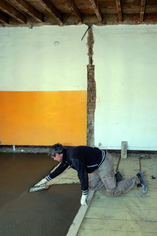 Miután a födémgerenda előkészítése megtörtént, 2,5 cm vastagságban Planitop HPC Floor T habarcs felhasználásával szerkezeti esztrich készült a meglévő födém felső részén. A termék állékonyságának köszönhetően az elterített anyag követte a födémlemez lejtését, így nem alakult ki túlzott anyagvastagság a deformálódott területeken.
