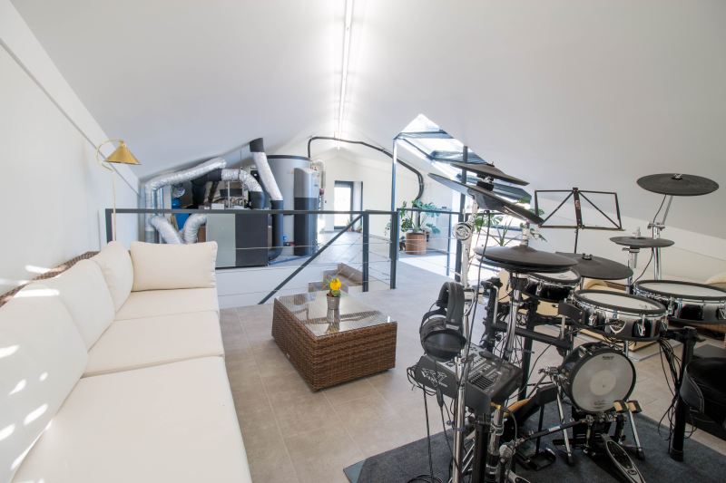 A padlástérben láthatók a gépészeti berendezések, a szolárkürtő legfelső szakasza, valamint egy kis – elvonulásra, kikapcsolódásra alkalmas – szoba