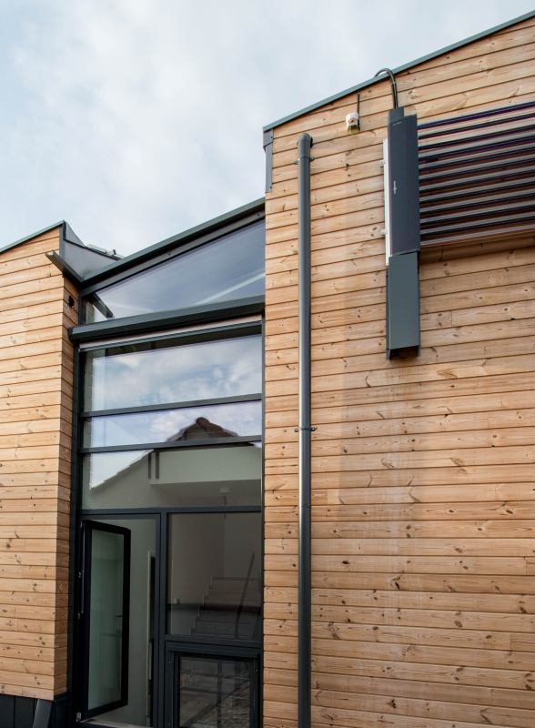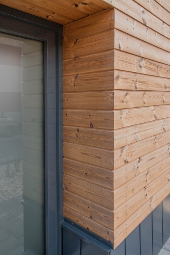 A homlokzatra Thermowood faburkolat került, mely a 150 fokos hőkezelésnek köszönheti rendkívül tartós időjárás-állékonyságát. A lábazat rendkívül magas szintű korrózióvédelmet nyújtó Lindab lemezzel burkolt, a műanyag nyílászárók pedig kívülről alumíniumburkolatot kaptak.