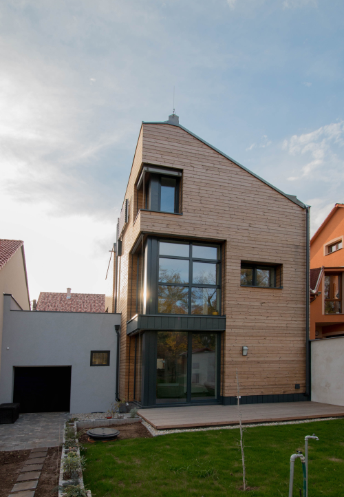 A homlokzati B30-as vakolt téglafalon 36 cm vastag Steico Zell befújt hőszigetelés található. A rendszer részeként épült be ide a Steico nútféderes rendszerlemeze, melyet 3,5 cm-es átszellőzőréteg választ el a fent említett homlokzatburkolattól. A szigetelés átfordul a tetőszerkezetbe is. Itt a Steicorendszer fa távtartói szarufaként funkcionálnak – „Nagyon előnyös, hogy így a hőszigetelő burok egységes módon, praktikusan kialakítható: a hőszigetelés és a tető tartószerkezete gyakorlatilag egy rendszer” – fűzi hozzá Kistelegdi István.