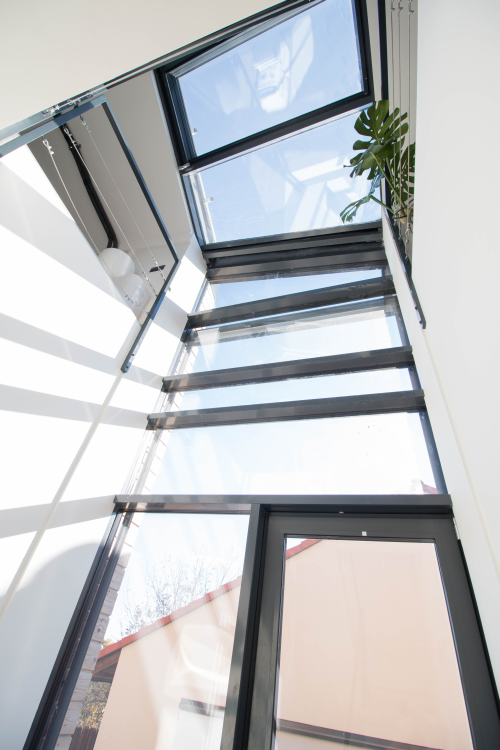 Minden lényegi tér ablaknyílásába tolóablak került: a Kömmerling terméke 88 mm-es, 6 légkamrás, középtömítéses német profilrendszerével, 3 rétegű üvegezéssel. A műanyag profilokra kívülről rápattintható alumínium védőprofil került. „Nagyon szeretem a tolóablakokat; praktikus megoldás, különösen akkor, amikor fektetett formátumú nyílászárókat alkalmazunk, továbbá ezekkel fokozatosan lehet szabályozni a levegő beáramlását; nem csak a csukott, bukott, illetve a nyitott állapot létezik” – magyarázza a döntés hátterét Kistelegdi István.
