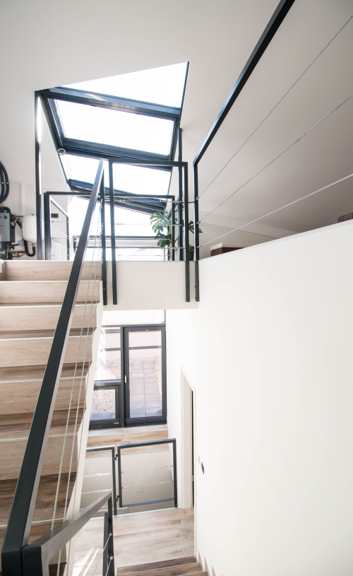 Az épület különlegessége az a teljes épületmagasságban függőlegesen áthaladó, mintegy 9-10 méter magas, de kis alapterületű udvar, melynek az épület szellőztetésében és energiaháztartásában is jelentős szerepe van – a professzor „szolárkürtőnek” nevezi ezt az épületelemet. A ház délkeleti homlokzatának „felhasításával” és a födémek áttörésével keletkezett, Schüco alumínium-üveg homlokzatú kürtő télen üvegházként fogadja be a természetes fényt, s ezzel a megvilágítás mellett a napenergia passzív hasznosításában is szerepet kap. Nyáron kívülről árnyékolják a függönyfalat, annak érdekében, hogy a túlmelegedést megelőzzék.