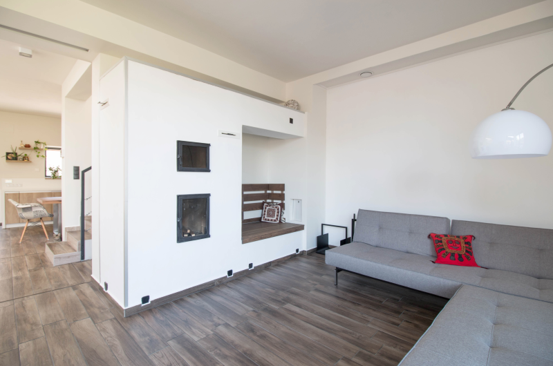 Szemben látható a tömegkályha, hangulatos ülőfülkével, alul a tisztítónyílásokkal. A kanapé fölött látható a hővisszanyerős szellőzés két befúvónyílása