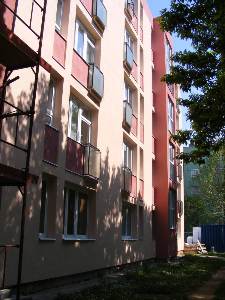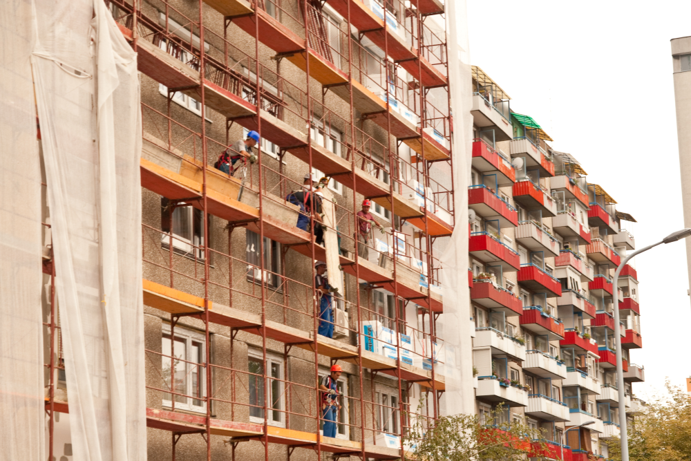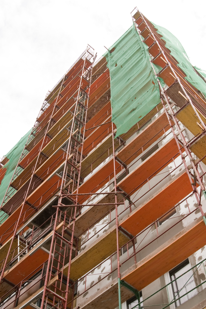 Először is állványozzuk be az egész épületet. A teljes állványzat biztosítani tudja, hogy egy-egy összefüggő homlokzaton ne kelljen az állvány mozdításával, függőbe állításával, rögzítésével foglalkozni a munkafolyamatok során. Az esetlegesen előforduló átállási szünetek bizony még az erősítő kéreg felvitelekor is meglátszódhatnak a végső felületen is. Színvakolat felvitelekor pedig biztosan látszódni fog egy-egy ilyen átállás nyoma. Ha már megvan az állvány, és folyamatosan tudunk rajta mozogni, akkor még egy nagyon fontos dologra használjuk ki a szabályosan felépített állványt: borítsuk a teljes állványzatot állványvédő hálóval. Ez egyrészt egységesen beárnyékolja a homlokzat teljes felületét, másrészt csökkenti a légmozgást, a szél szárító hatását a munkák során.