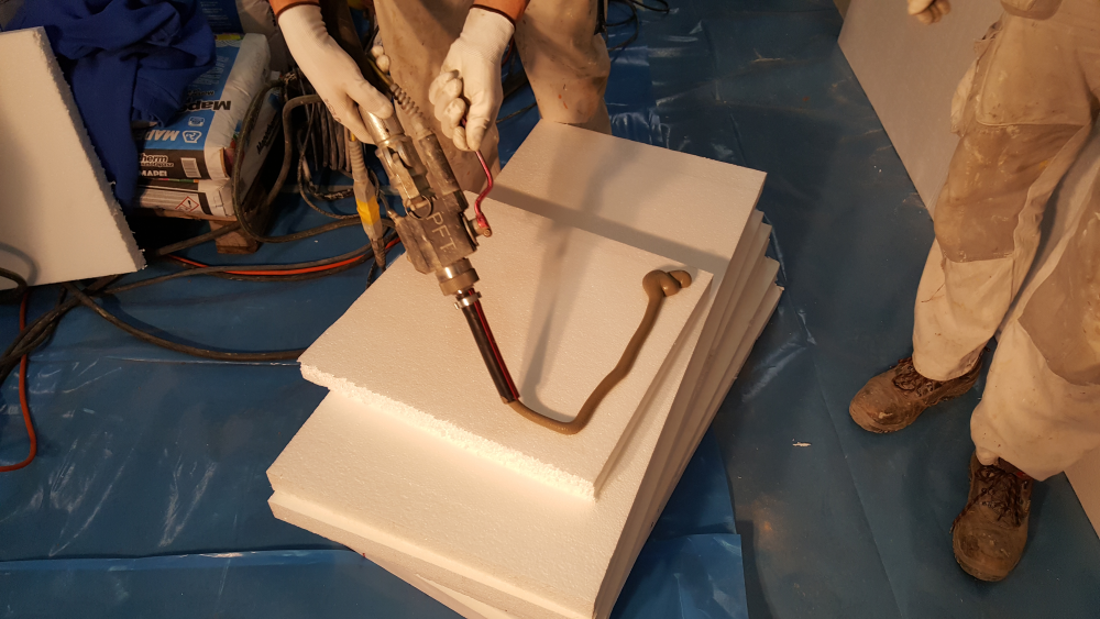 Ehhez a feladathoz egy szabályozható sebességű csigás habarcsszivattyú a jó megoldás, a tömlő végén a ragasztó felviteléhez alkalmas pisztollyal. A legoptimálisabb megoldás, ha a habarcsszivattyú garata közvetlenül a horizontális keverő alá kerül, így a megkevert friss anyag egyből átkerül a szivattyúba. Fontos, hogy az anyagtovábbítás sebességét a nekünk kényelmes mértékre állítsuk, úgy, hogy kényelmes kézmozdulatokkal, folyamatos, megfelelő vastagságú hurkát kialakítva tudjuk felvinni a ragasztót a hőszigetelő lap hátoldalára. Cégünknek a PFT Swing M és a Turbosol T7 habarcsszivattyúkkal van a legtöbb tapasztalata, de más Putzmeister, M-tec, Inotec, Wagner vagy más gyártók hasonló habarcsszivattyúi is megfelelő megoldást jelenthetnek.