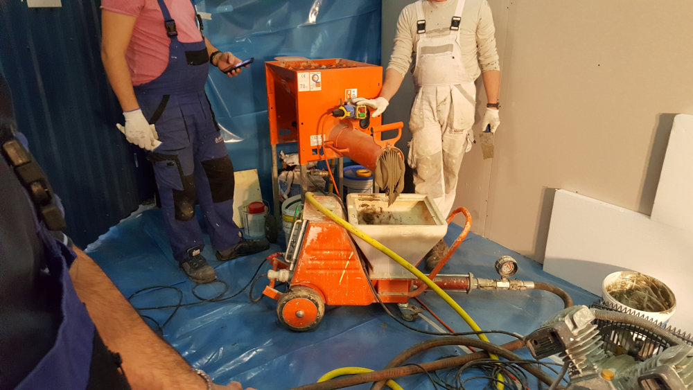 Felmerülhet a kérdés, hogy vakológépet, vagyis folyamatos üzemű keverőszivattyút alkalmazhatunk-e erre a feladatra. Akinek van vakológépe, annak érdemes egy próbát tennie, és akár jó is lehet, de nem feltétlenül ez az optimális megoldás. Egyrészt nem állítható az anyagtovábbítás sebessége, másrészt jóval kevesebb idő jut az anyag átkeverésére. Előbbire, azaz az anyagtovábbítás sebességére a csiga-csigaköpeny lehet a megfelelő választás, például 4-2-es csiga-csigaköpeny alkalmazása a szokásos 6-3-as helyett, míg utóbbin valamennyit javít, ha a vakológépet kiegészítjük egy a csiga alá szerelt utókeverővel. Ami még nehezíti a vakológép alkalmazását, az annak az áramigénye. A nálunk elterjedt gépek esetén ez 3×25 Amper, aminek a biztosítása – különösen kisebb felújítások esetén – plusz feladat és költség.