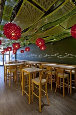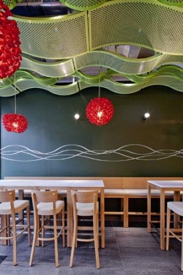 Az ausztriai Parndorf bevásárlóközpontjának egyik éttermében, a Bistro Asia Cocosban a Mevaco alumíniumból készült, Creative Line Arabica perforált lemeze gondoskodik a tenger illúziójának megteremtéséről. Az ötletes hullámok az ügyesen elhelyzett LED-világítással varázslatos fény-árnyék hatást hívnak életre.