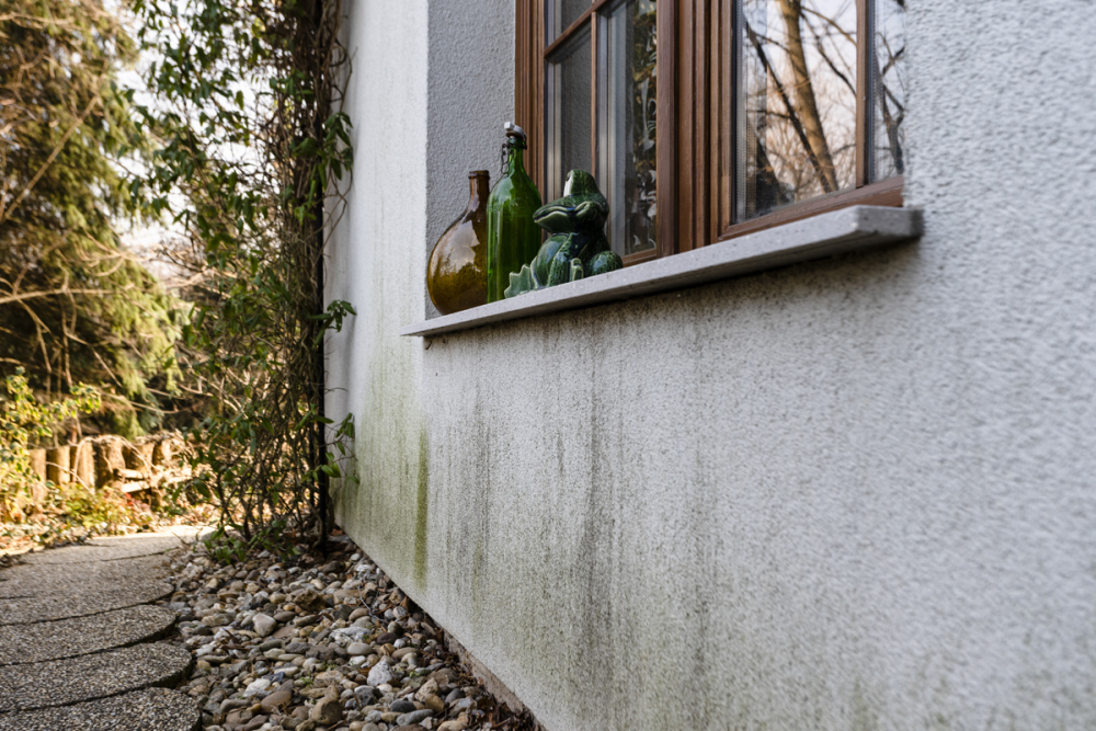 Ha a homlokzat felülete folyamatosan (vagy gyakran) nedves, előbb-utóbb megjelennek az algák (zöld) és a penészfoltok (szürke). Bár a homlokzat fizikailag nem sérül, de nem esztétikus, és az ingatlan értékét rontja