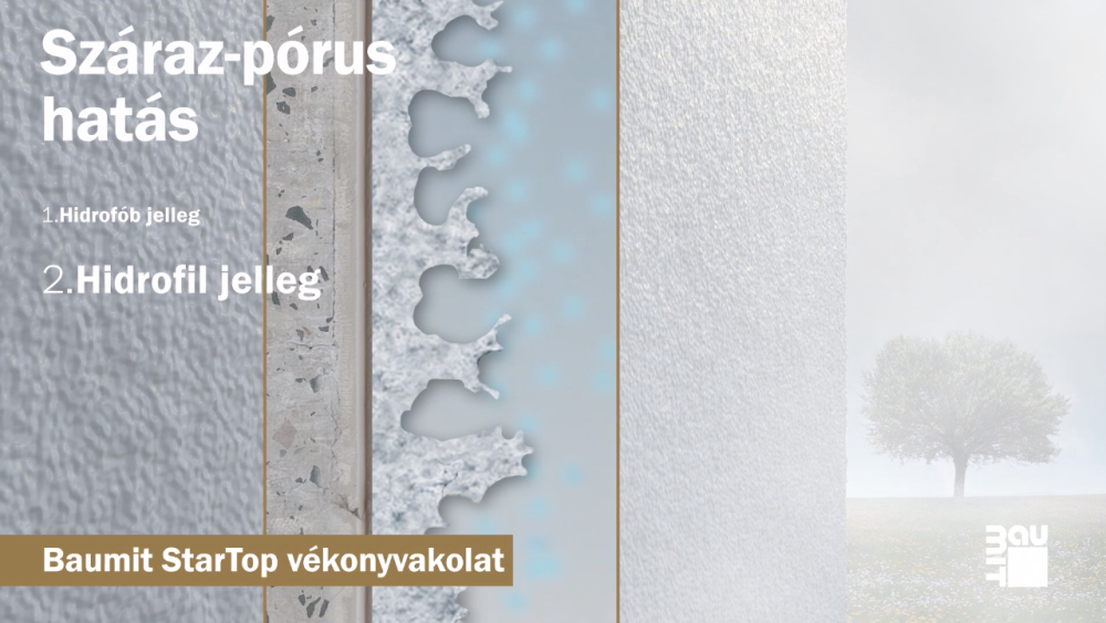 A korall felépítéséhez hasonlóan a Baumit StarTop vékonyvakolat külső rétege porózus kialakítású, csak mikroszkóppal látható, sok apró üregből és pórusból áll, ami a rá kerülő víz nagyobb felületen történő eloszlását és felszívódását teszi lehetővé. A vakolat szemcsestruktúrájából következő száraz-pórus hatás eredménye a homlokzat gyors száradása.