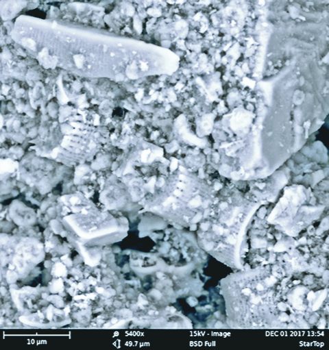 A Baumit StarTop vakolat felületének mikroszkopikus felvételén látszik, hogy a struktúra nagy felületet képez, így hatékonyan oszlik el a nedvesség