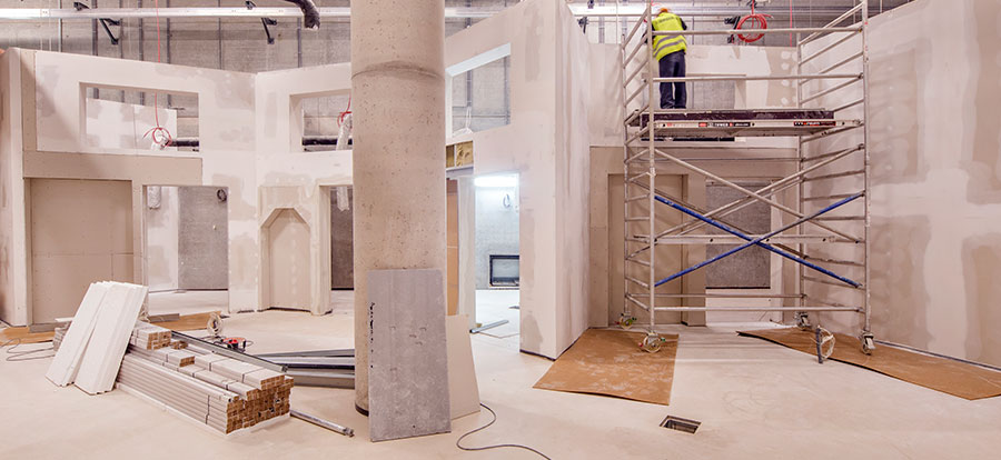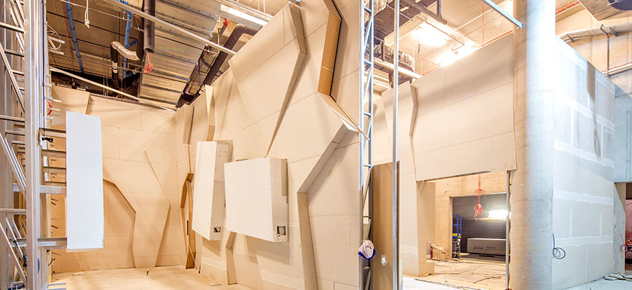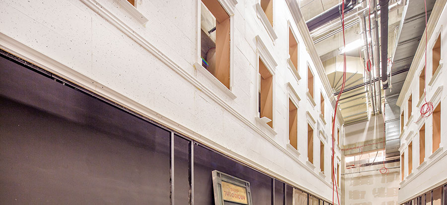 A nagy belmagasságú kiállítóhelyiségekben pedig a Nida Twarda gipszkarton lapokkal oldották meg a magas, osztott falak kialakítását több mint 1000 négyzetméteren. A mechanikai sérülések lehetőségét is szem előtt tartva a falfelületeknek erősnek és tartósnak kell lenniük, kiszolgálva a jelentős forgalmat, ezért választották a Nida Twarda lapokat, melyeknek faforgáccsal erősített magja biztosítja a keménységet.