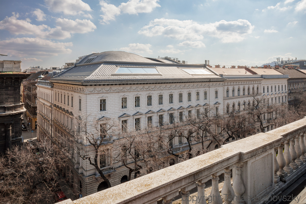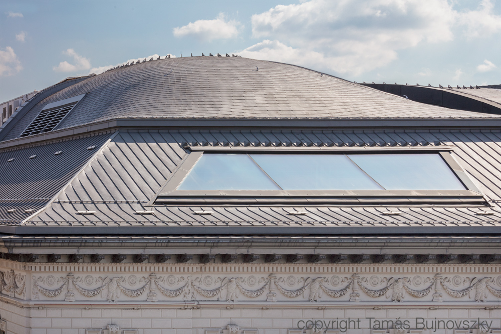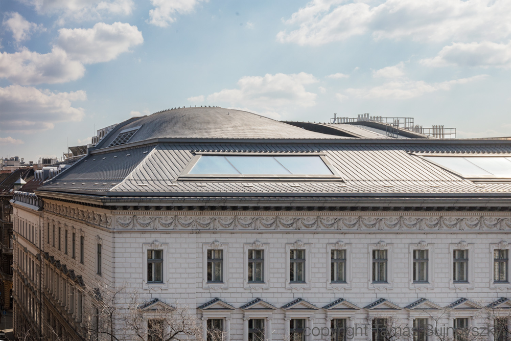 A palotabérházból átalakított luxus áruházi palota a történeti udvar felett záródik le, innen egy más, modern mai világ indul. A budapesti bérházak jellemzője volt a beépítetlen tetőtér, hiszen a cselédlakások a hátsó traktusokban voltak, ellentétben például a párizsi manzárdtetőkkel. A tetőbeépítéssel az étterem és a bár új, kortárs karaktert kapott. Az utcai oldalakon a gerincig tart az eredeti tetősík, a belső részen egy acél keretvázas tartószerkezeten nyugvó, szabadon formált, emelkedő „lepel” rejti magában a kétszintes beépített teret, közepén az üvegtető felett nyitott belső udvarral, magába rejtve a gépészeti berendezéseket is. A lepel kétszer görbült felületét a műemlékhez illeszkedő, egyedi, kiselemes, PREFA lemezfedés borítja. Formája a belső galéria kilátópontja felé emelkedik, oda, ahonnan a bazilika és a budai oldal a legszebben tárul fel.