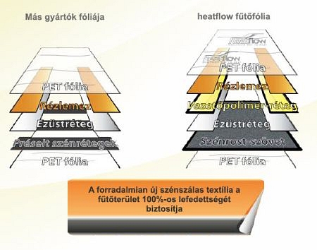 A Heatflow fóliában fűtőelemként szénszál és szénpaszta keverékéből álló textília található (a hasonló termékekben csak szénpaszta van, amit nyomdai eljárással visznek fel a fóliára). A szénszálas textília alkalmazásának köszönhetően a fűtőszőnyeg élettartama rendkívül hosszú (több mint 30 év), egyúttal kizárt a felszín lokális felmelegedése is.
