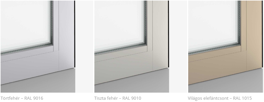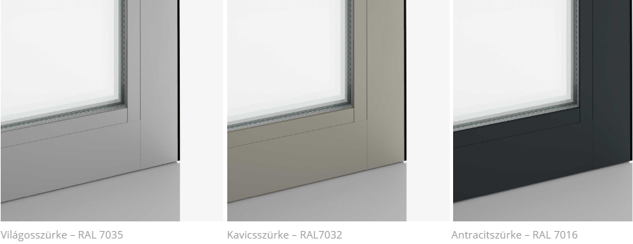 A Centor integrált emelő-toló erkélyajtók a tartósság és a könnyű karbantarthatóság érdekében alumíniumból készülnek, de belső oldaluk mindig faborítást kap. Az alumíniumfelület a Centor standard színkínálata szerinti színekben rendelhető, illetve egyedi, a RAL színskála szerinti színben is elérhető. A küszöb festhető a tokkal és a szárnnyal harmonizáló színre, de meghagyható alumíniumárnyalatban is.