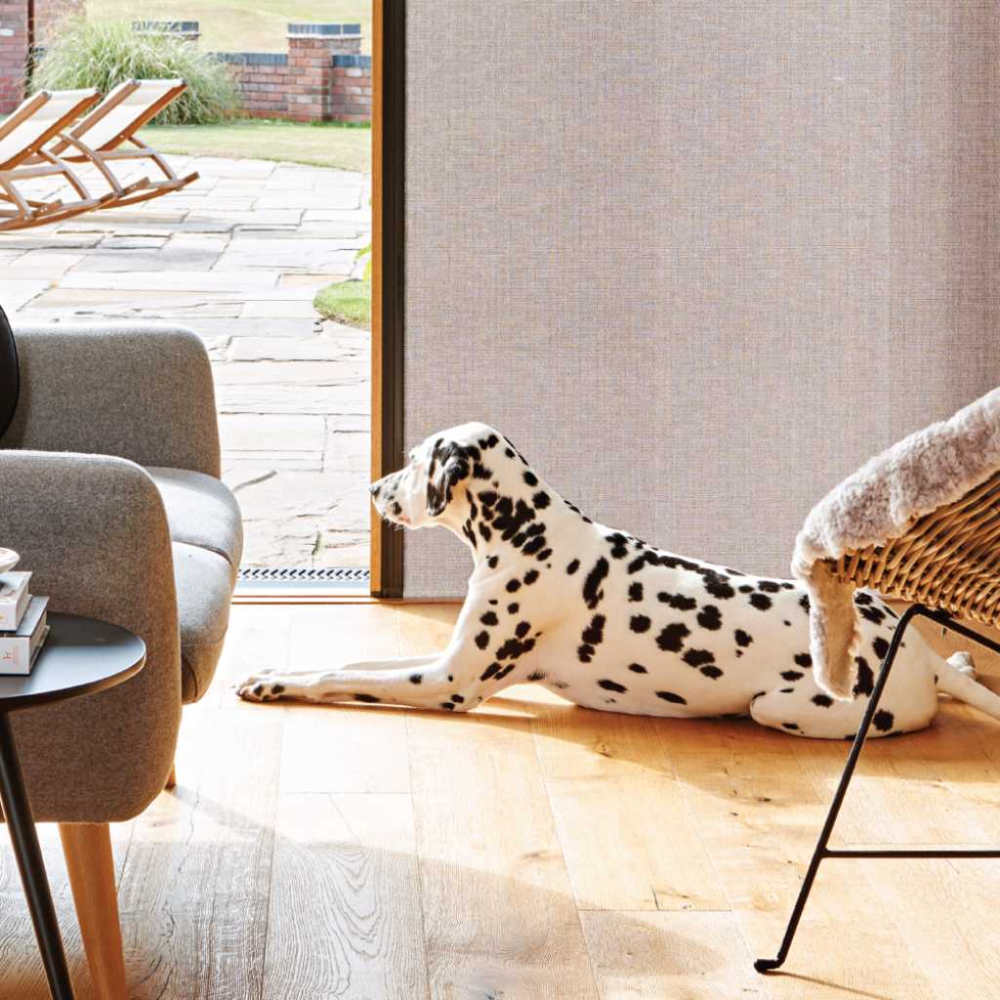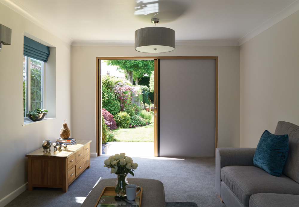 Az ajtók rögzített, keret nélküli panele és a keskeny tolóajtószárny nyitott és csukott állapotban is összhangban állnak egymással.