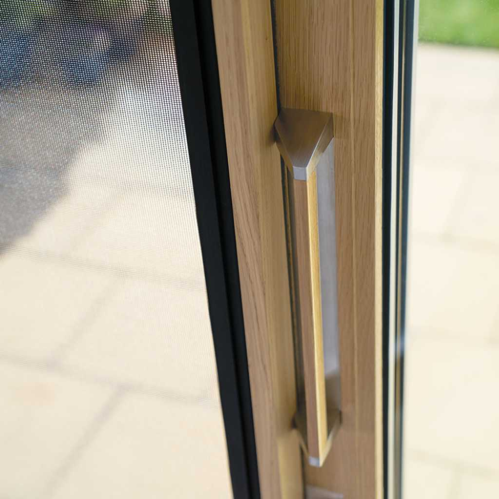 A fogantyúk fekete vagy szálcsiszolt rozsdamentes acéltartókra helyezett, az erkélyajtó belső felületéhez illő famarkolattal kaphatók.