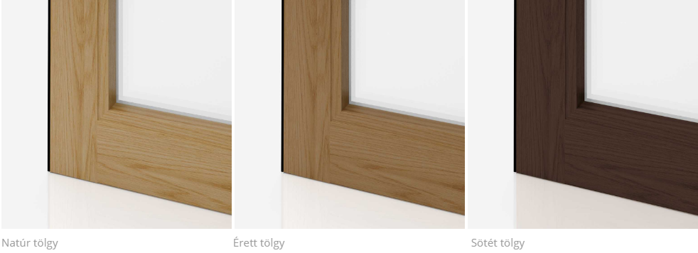 A Centor erkélyajtók belső oldala meleg hangulatot árasztó tömör tölgyfaborítással készül. A tölgyfaborítás natúr tölgy, érett tölgy vagy sötét tölgy lehet, de – igény szerint festhető vagy lazúrozható – nyers vagy alapozott változatban is rendelhető. A küszöb – az ajtókerettel és a szárnnyal harmonizáló – faborítással is készülhet .
