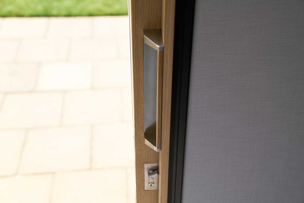 A süllyesztett kivitelű SafePull külső fogantyú (szabadalmaztatás alatt áll) amellett, hogy biztonságos használatot garantál, rendkívül esztétikus is, mivel alkalmazásával egy síkba hozható a tolóajtószárny és a rögzített elem oldalvonala.