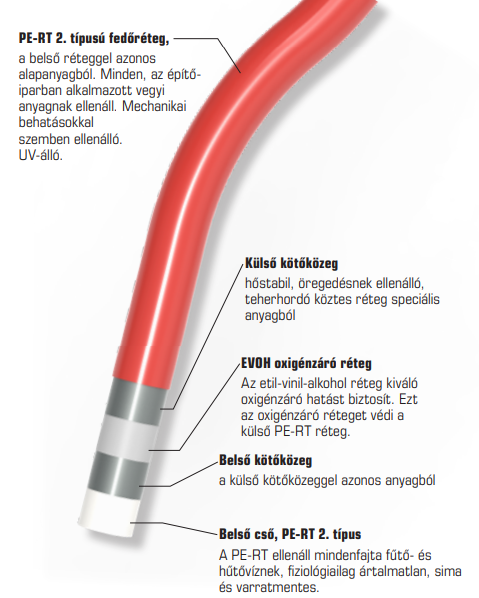 A KU100 2. típusú Ultra PE-RT haszoncső – speciális molekulaszerkezetéből adódóan – kimagasló mechanikai tulajdonságokkal bír és a PEX csövekkel ellentétben nem kémiai anyagokkal térhálósított. A PE-RT csövek ezáltal 100 százalékban újrahasznosíthatók. A csövek rendkívül rugalmasak, ami jelentősen megkönnyíti fektetésüket és kezelésüket. Az ötrétegű rendszer megbízhatóan védi az oxigénzáró réteget a károsodástól.