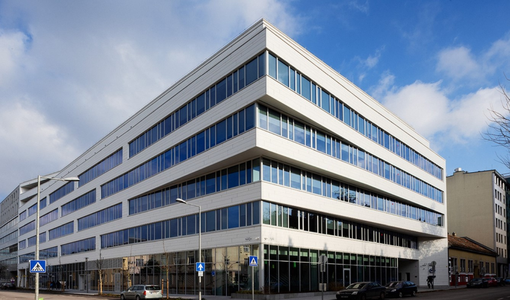 A budapesti irodaépület homlokzatát fehér színű árnyékfugás Siding elemek díszítik, amelynek kivitelezése minden részletét tekintve kiváló minőségű. Jóllehet a csomópontok kialakítására nem minden esetben kínálkozott standard megoldás, azok kialakítása az esztétikai elvárások mellet műszaki szempontoknak is maximálisan megfelel. Az épületen nemcsak függőleges, hanem – pl. a mennyezeten – vízszintes irányú burkolatot is láthatunk. A vízszintes kiosztású Siding burkolat – a síktöréssekkel tagolt épületforma ellenére is – a kivitelezés precizitásának köszönhetően egységes képet nyújt. A homlokzatburkolat nyílászárókhoz és egyéb épületszerkezetekhez történő csatlakoztatása is példás.