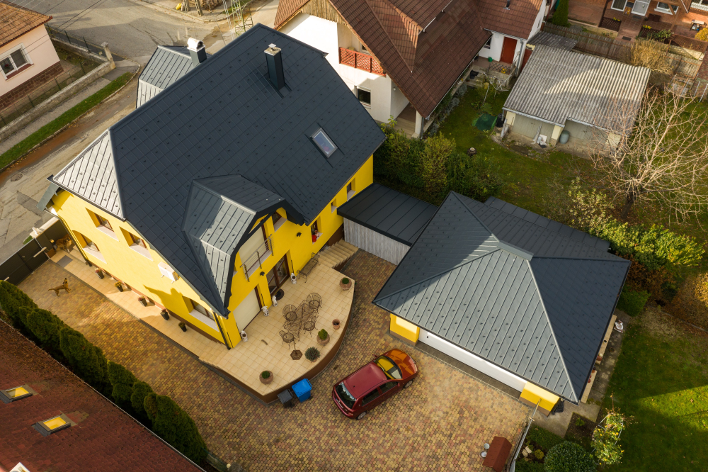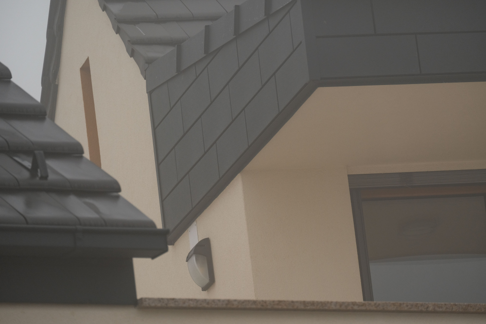 A veszprémi családi ház tetőfedése antracit színű Prefa Classic fedéssel készült, amelyet lécezésre rögzített a kivitelező. A tetőfelület tetősíkablakokkal áttört, amelynek szegélyezései pontosak. A tető kisebbik felületén található, manzárd síktöréshez kapcsolódó csomópontot magabiztosan oldotta meg a kivitelező. A fedés vonalai pontosak, a vápacsatlakozás az alkalmazástechnikai előírásoknak megfelelően kivitelezett. Az oromzat burkolása antracit színű Prefalz lemezzel történt. A minőségi munka eredményeképpen a legapróbb részletekig tökéletes tető készült.