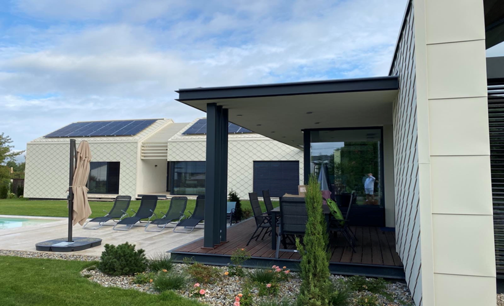 A Telkiben épített családi ház megjelenése lenyűgöző, amelyben természetesen szerepe van az épület fehér színű PREFA 29×29-es rombusz esztétikai megjelenésének és a párját ritkító, precíz kivitelezésnek is. Az épületburok rombuszfedése pontos kiosztású, csomópontjai elegánsak, letisztultak. Az csomópontok megjelenéséből és a kész burkolat összképéből a kivitelező tökéletes alkalmazástechnikai ismeretére, nagyfokú anyagismeretére és anyagmegmunkálási gyakorlatára következtethetünk.