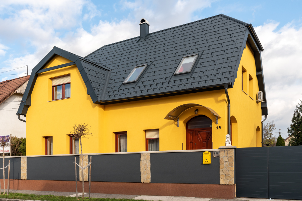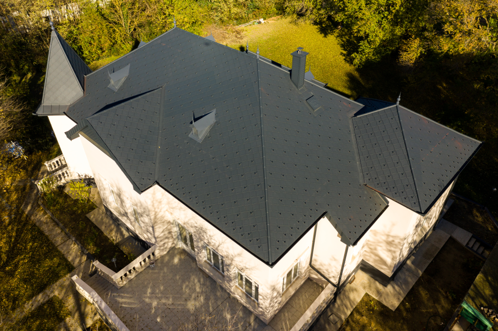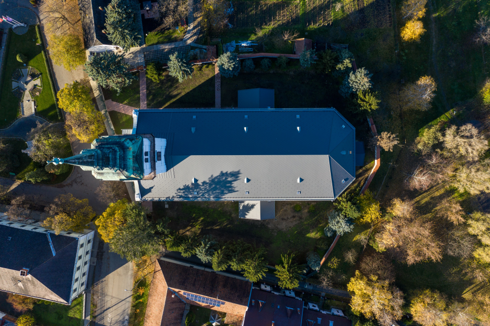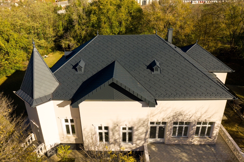 A régi építésű kúria méltó koronát kapott. A Prefa 29×29 es rombuszfedés valóban az épület éke lett. A fedés kiosztása precíz, a legapróbb részletekre kiterjedő. A tető vízelvezetését félkörszelvényű csatornával oldották meg, amelyre egyedi gyártású szegletdíszek és végdíszek kerültek. Az épület oromrészeit és oromfalazatát antracit lemezburkolat fedi. A tetőn található kémények egyedi gyártású burkolata szintén kifogástalan minőségben készült. A tetőfelületek metszésvonalában kialakult enyhe lejtésű csomópontok kialakítása teljes mértékben teljesíti a szakmai elvárásokat.