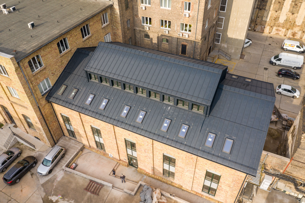 Az L alakú, félnyeregtetős épület korcolt lemezfedése antracit Prefalz lemezből készült. A félnyeregtető függőleges szegélyezésének kiosztása esztétikus, a korcolt lemezfedéssel való anyagkapcsolat kialakítása kiváló. A fedés minden apró részletében szakmailag tökéletes. A kivitelezés magas színvonalú. A korcolt lemezfedésben található tetőáttörések csomópontjai nemcsak szemet gyönyörködtetők, hanem egyben példaértékűek is. A tetőfelület sávkiosztása tökéletes, egységes. A sülyesztett vápakialakítás elegánssá és letisztulttá teszi a tető megjelenését.
