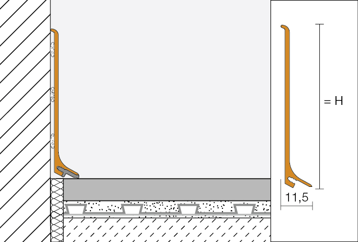 Az alumíniumprofilok alkalmazhatók a faltőben lábazati csempe helyett, de kitűnő megoldást nyújtanak szögletes és kör keresztmetszetű pillérek lábazatképzésében is, a burkolat és a függőleges sík stílusos kapcsolódására.