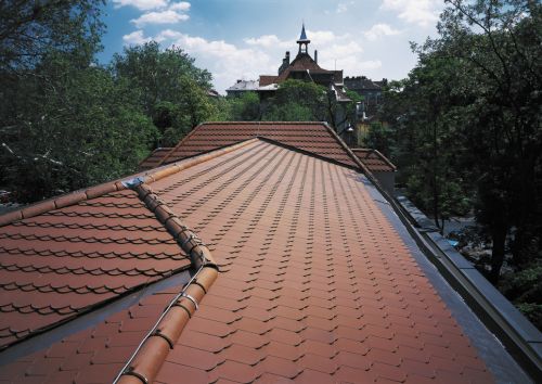 A jellegzetes karcsú, visszafogottan elegáns forma és színvilág, valamint az engóbozás harmonikus szépségű felületet hoz létre a tetőn.