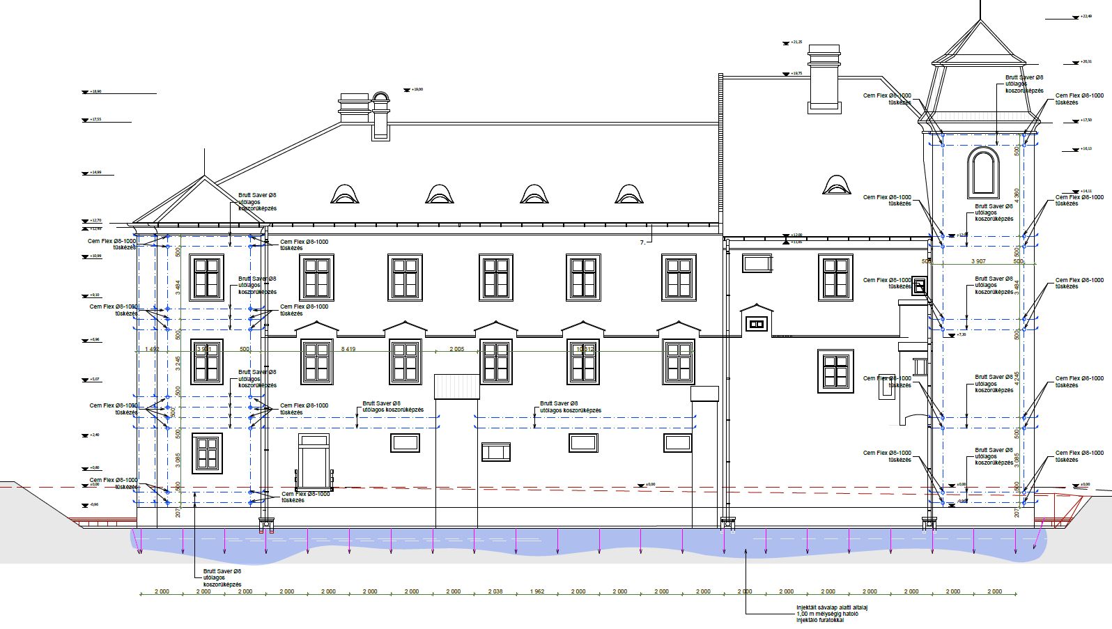 A toronytestek felmenő falazatának merevítését utólag beépített Brutt Saver koracél spirálos koszorúvasalásokkal és függőleges oszlopvasalásokkal állítottuk helyre.