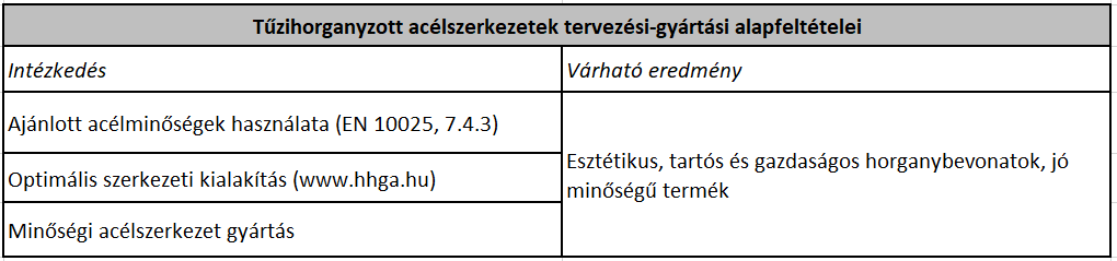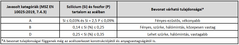 Az acélszerkezetek tervezői számára jól ismert a melegen hengerelt szerkezeti acélokra vonatkozó MSZ EN 10025-2:2019 szabvány, melynek 7.4.3 pontja tartalmazza azokat az iránymutatásokat, melyek a tűzihorganyzásra leginkább ajánlott acélok összetételére vonatkoznak. Ezek tömegacélok, beszerzésük megfelelő szakértelemmel rendelkező acélkereskedésben – normális kereskedelmi viszonyok között – nem okoz problémát. A képződő horganybevonat vastagságát, megjelenését elsősorban az acélokban lévő szilícium (Si), valamint a foszfor (P) mennyisége szabja meg. Kedvezőtlen esetben túl vastagok lesznek a fémrétegek, melyek rontják a termék gazdaságosságát, esetleg esztétikai megjelenését. Az alábbi táblázatban foglaltuk össze a legfontosabb tudnivalókat.