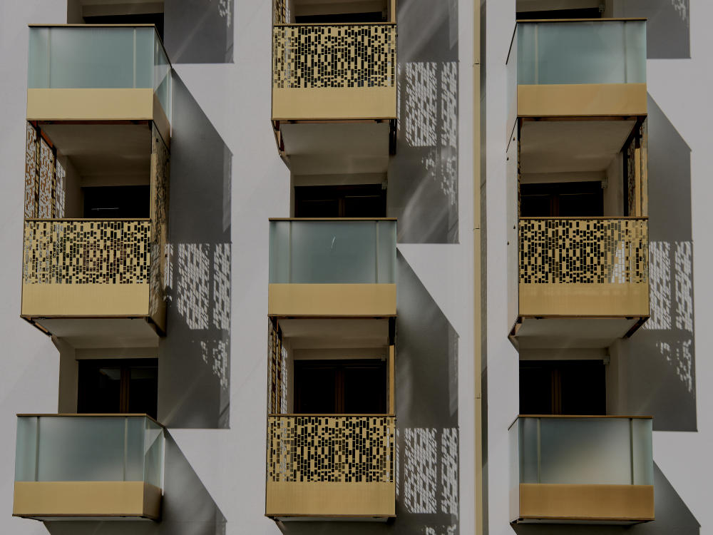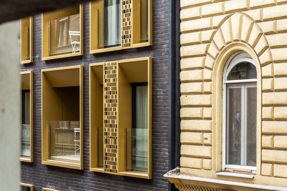 Érdekes feladat volt a homlokzati nyílászárórendszer megtervezése, mivel itt a számos statikai kérdésen kívül a tűzvédelmi szempontok is hangsúlyosan felmerültek. Ezekben a csomópontokban rögzíteni kellett az erkélykorlátokat, a hőszigetelést, a homlokzati téglaburkolatot, valamint az ablakok körüli fémkereteket is. Mindeközben a parapet nélküli nyílászárókat hátrébb kellett húzni a homlokzat síkjából, így ugyanis a homlokzati tűzterjedési gátnak nemcsak függőleges, hanem vízszintes szakasza is kialakult, és ezzel megnőtt a tűzszakasz hossza. Ez szükséges volt annak érdekében, hogy az épület megfeleljen a tűzvédelmi előírásoknak. Az ablaksík eltolásának más hatása is volt: érdekes fény-árnyék játékot eredményez az elkészült lakásokban. A homlokzati nagy nyílászárók és a belső udvar együttesen jelentősen növelték az elkészült lakások benapozottságát.