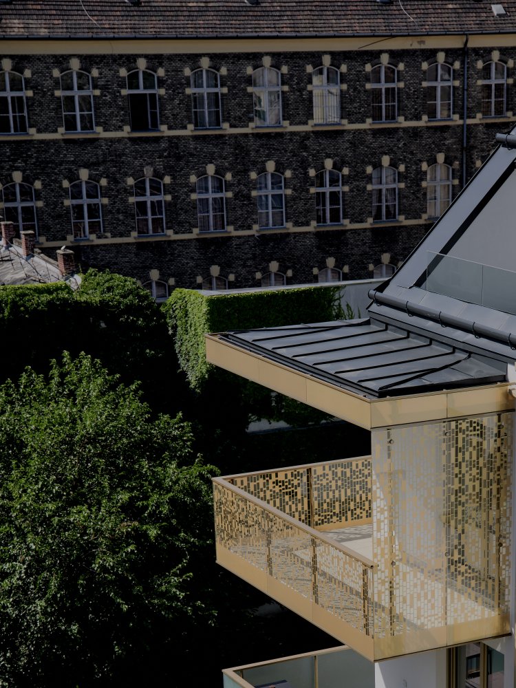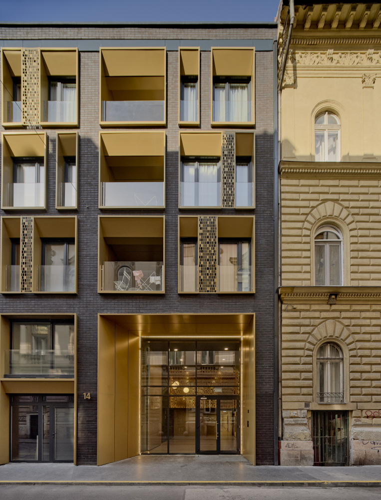 A sűrűn beépített pesti belváros foghíjtelkén az építkezés megszervezése sem volt egyszerű feladat, ám a szűk helyre sikerült korszerű, karakteres, a hagyományos utcakép látványvilágához is illeszkedő – az Év Háza pályázaton is díjat nyert – társasházat felhúzni, melynek udvari ablakai és teraszai ráadásul tágas zöldterületre néznek.