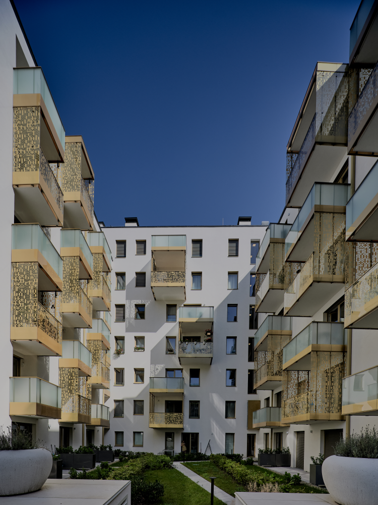 Annak érdekében, hogy az új épület minél kevésbé térjen el ettől az elrendezéstől, az utcai homlokzatra 2,1 méter magas nyílászárókat és loggiákat terveztek, amelyeket – a Zellerin-féle vasművek emlékét idézve – egy-egy acélkeret ölel körbe, egyes nyílászárók között pedig ezeket a kereteket egy-egy azonos színű perforált lemezzel kötötték össze. Az egyedileg, méretre gyártott lemezek arany színe jól kiegészíti az épület sötét, antracit színű klinkertégla-burkolattal készült homlokzatát, a perforált minta inverze pedig a belső üvegfelületeknél köszön vissza. A helyi építési szabályoknak megfelelve a felszín alatt 3 szintes, 122 férőhelyes parkolót, a földszinten kiadható üzlethelyiségeket, az első emeleten irodákat, fölötte 6 szinten pedig a Cordia mint beruházó által előírt lakásmixet alakították ki. A lakásszámokat és -méreteket a környező fejlesztések vásárlóinak visszajelzései alapján határozták meg, így végül több mint száz önálló, erkéllyel rendelkező lakás kapott helyet az épületben. A helyi védettség miatt a társasház tervezett kialakítását a többi engedélyező hatóságon kívül az önkormányzattal is egyeztették, ez utóbbitól azonban főként az elképzelt tetőformával kapcsolatban kaptak módosítási kérést. Az épület – az utcakép szempontjait is figyelembe véve – félnyeregtetőt kapott.