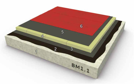 1. Aljzat/tetőfödém 2. Bitumenes kellősítés (Idroprimer) 3. Adeso párazáró réteg (Polyvap SA) 4. Hőszigetelés 5. Adeso bitumenes vízszigetelő lemez (első réteg) 6. Adeso bitumenes vízszigetelő lemez ásványi zúzalékkal (zárólemez)